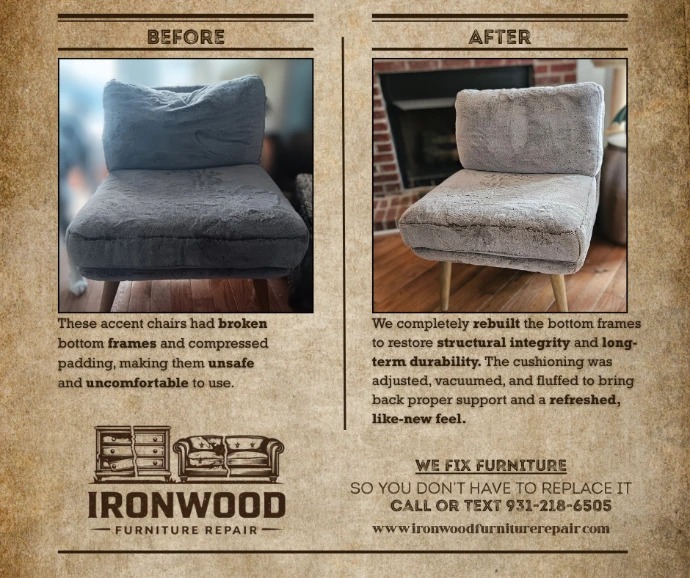 Having over a decade of experience in this trade, we have worked for others that whole time- from company to company. It was time to finally establish ourselves in our own company to help others. We established Ironwood Furniture Repair LLC in January of 2026. While we are new to ownership, we are eager to learn, grow and continue our careers in this field we are so passionate about. Let us help you enjoy your spaces with clean, non broken, quality furniture. Follow along with us on Facebook and Instagram as we continue to fix furniture and grow as a team. Thank you!